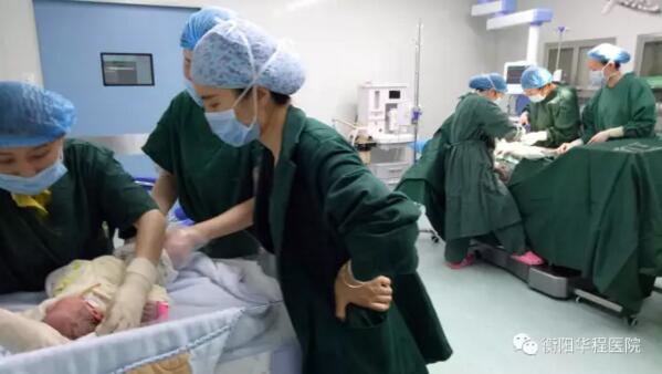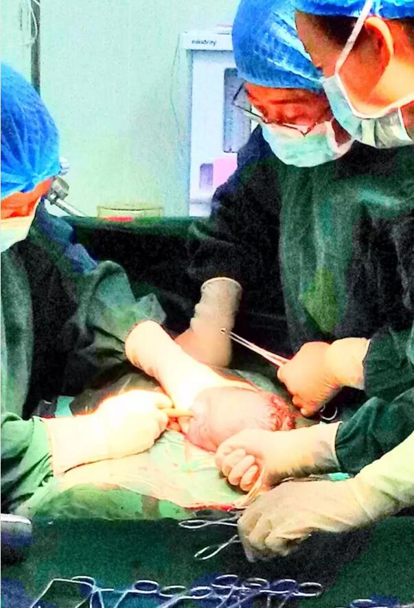 手術(shù)進(jìn)行時(shí),寶寶已經(jīng)露出了小腦袋,醫(yī)護(hù)人員正在清理寶寶鼻腔。