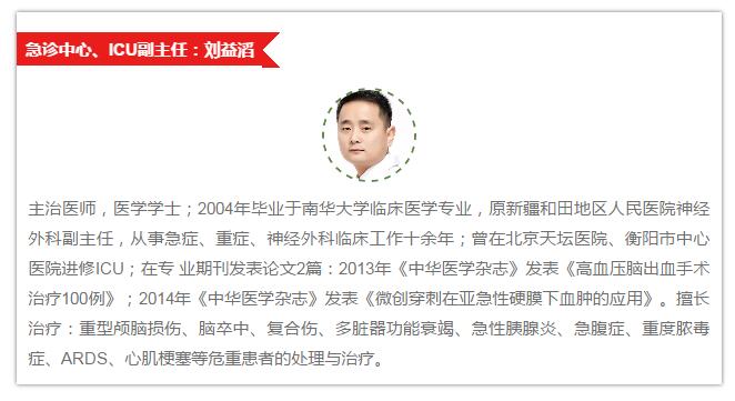 擔(dān)任衡陽(yáng)華程醫(yī)院急診科、ICU副主任的劉益滔在年輕的外表下早有了十余年從事急癥、重癥臨床經(jīng)驗(yàn),他負(fù)責(zé)的主要工作是全院危重病人的院前急救、院內(nèi)急救、重癥監(jiān)護(hù)治療等,同時(shí)還要負(fù)責(zé)院內(nèi)神經(jīng)外科重癥患者的手術(shù)治療。