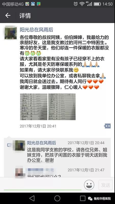 這是衡陽華程醫(yī)院副院長黃波在12月1日微信朋友圈發(fā)出一條公益愛心捐助號召信息,立馬得到了大家的響應(yīng),12月3日醫(yī)院院辦一行六人開著救護(hù)車來到了祁東縣河洲鎮(zhèn)二中,為這群孩子們帶去御寒衣物。孩子們臉上的笑容,讓在場的人們無不感動。