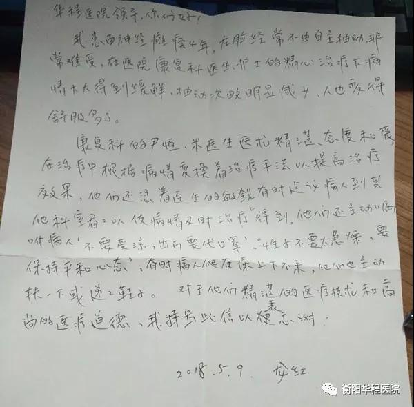 5月10日康復中心收到面神經(jīng)癱瘓4年患者龍紅的感謝信,患者以平實的文字對病情好轉(zhuǎn)進行了講述,為此還特意對科室醫(yī)生尹恒和米醫(yī)生提出了表揚。