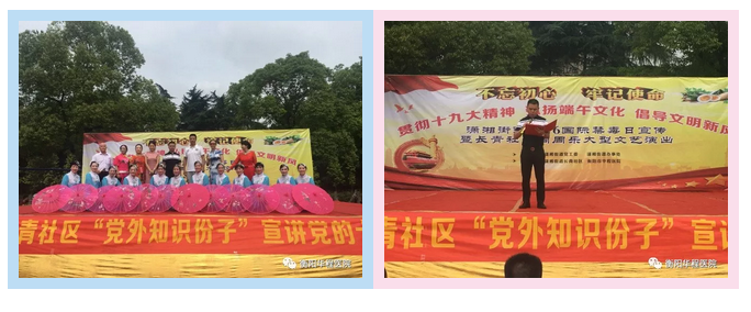 6月14日上午9時(shí),石鼓區(qū)瀟湘街道長(zhǎng)青社區(qū)攜手衡陽(yáng)華程醫(yī)院在西湖公園舉辦“不忘初心 牢記使命 貫徹十九大精神  弘揚(yáng)端午文化 倡導(dǎo)文明新風(fēng)瀟湘街6.26國(guó)際禁毒日宣傳暨長(zhǎng)青社區(qū)周周樂(lè)”大型文藝演出活動(dòng),副院長(zhǎng)黃波到場(chǎng)并致辭。