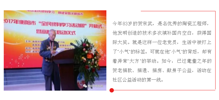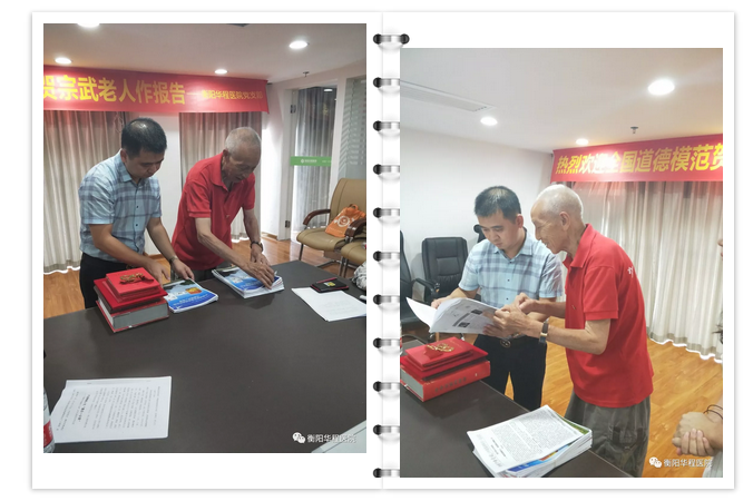 去年,賀老來華程醫(yī)院做體檢,得知情況后,醫(yī)院主動為他免去了體檢費(fèi)用,并決定每年為賀老夫婦免費(fèi)做一次體檢。以大愛服務(wù)患者,老人現(xiàn)場將典籍一冊、《人生記實(shí)》光碟6張、中央黨校雜志等資料30份,以及勛章、證書等敬贈給醫(yī)院,勉勵大家牢記“就醫(yī)一次,服務(wù)一生”承諾,為衡陽人民健康保駕護(hù)航。