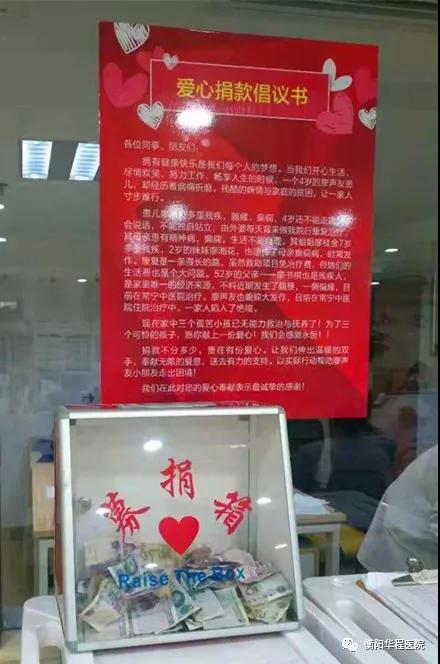 贈(zèng)人玫瑰,手有余香。醫(yī)院知悉孩子家庭情況后,在院辦公室和策劃部的安排下特別為患兒廖聲友撰寫了愛心捐款倡議書,并設(shè)置捐款箱,號(hào)召全院員工伸出援助之手,積極為患兒廖聲友捐款,用實(shí)際行動(dòng)支持患者與病魔作斗爭。這一倡議立即得到了醫(yī)院全體員工的熱烈響應(yīng),各大科室組織工作人員捐款。據(jù)悉,目前共籌集1774.8元,直至今天愛心仍在匯聚,幫助這個(gè)家庭度過眼前這個(gè)難關(guān)。