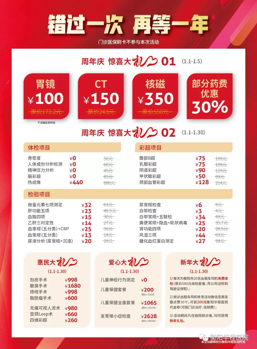 據(jù)醫(yī)院負責人介紹,本次活動從2019年元月1日開始到元月30日結束;顒臃秶土Χ瓤芍^前所未有:大檢查、常規(guī)檢驗、藥費的巨惠推出讓患者想都不敢想,常見疾病的治療更是推出了包干價。這真讓老百姓體會到了既能少花錢又能治好病的實惠。