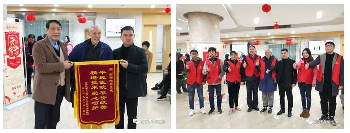 就在元宵節(jié)當(dāng)天醫(yī)院收到了一份珍貴的禮物,道德模范賀宗武老人送來鑲印著“平民醫(yī)院 平價收費 精湛技術(shù) 愛心呵護(hù)”字樣的錦旗,副院長黃波和醫(yī)務(wù)部部長張平接受敬贈。