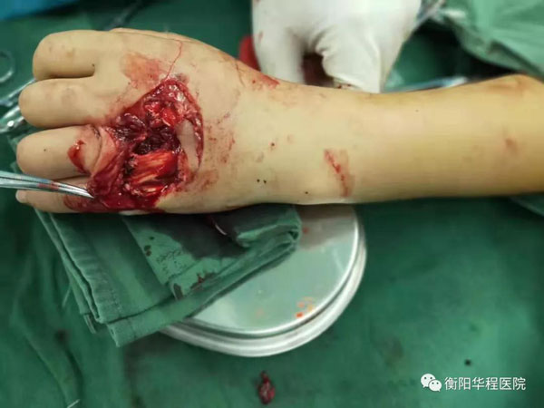 18:50,救護(hù)車到達(dá)醫(yī)院,醫(yī)護(hù)人員兵分多路開展救治,一組為患者完善各種身體檢查,并通過輸血、補(bǔ)液等一系列措施維持患者生命體征,另一組則對傷口進(jìn)行清創(chuàng),把壞死的肌肉組織等全部清理干凈,為接下來的手術(shù)做好準(zhǔn)備。