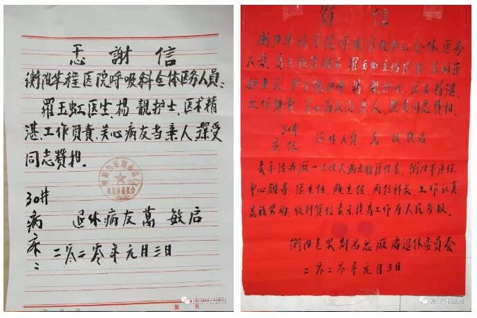 萬老爺子今年80歲,近2年一直被反復(fù)咳嗽、氣促折磨,2019年12月28日因感冒引發(fā)咳嗽、胸悶以致晚上不能平睡、并且感覺左下肺以左大腿內(nèi)側(cè)抽筋樣疼痛,被家人用輪椅推送入院,入院后,經(jīng)消炎、平喘、霧化等對癥治療,十天后病情好轉(zhuǎn),患者要求出院,出院時(shí),為感謝科室全體醫(yī)護(hù)人員精心治療,親手寫下了感謝信。