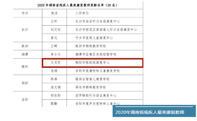 我院獲得“2020年湖南省最受殘疾人歡迎康復(fù)醫(yī)療機構(gòu)”榮譽,康復(fù)中心主任王靈芝獲“2020年湖南省殘疾人最美康復(fù)教師”表彰。