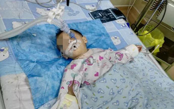 患兒小毅,1歲零十個(gè)月,12月15日出現(xiàn)發(fā)熱,體溫波動(dòng)于38-39.0℃,12月17日中午患兒出現(xiàn)陣發(fā)性咳嗽,精神欠佳,下午17:00左右出現(xiàn)氣促、發(fā)紺、呼吸困難、煩躁不安,家長(zhǎng)立即送往當(dāng)?shù)蒯t(yī)院急診科,入院后小毅出現(xiàn)昏迷,心電監(jiān)護(hù)示心率波動(dòng)于180-200次/分,吸氧